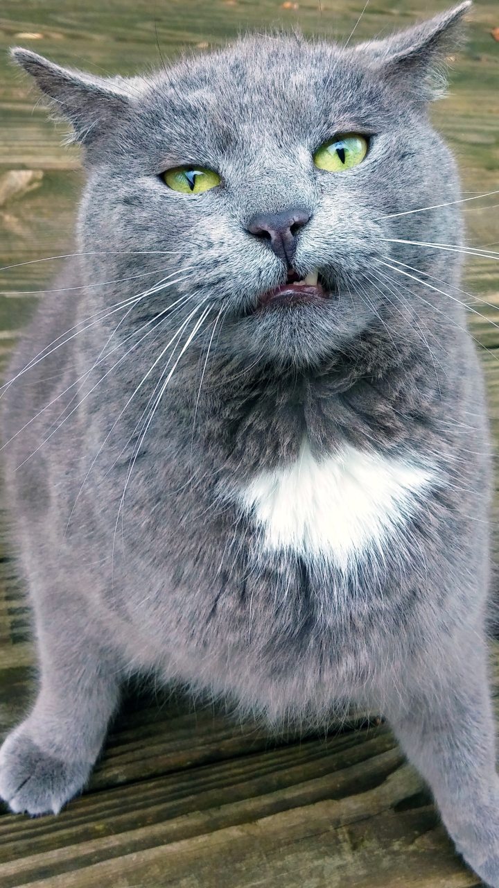 Funny cat face is an charming expression that reflects the personality of a gray feline with a white spot. This image features a funny cat face. The picture with this funny cat face may be downloaded in multiple HD formats, perfect for entertainment. Cats sometimes are so cute and amazing!