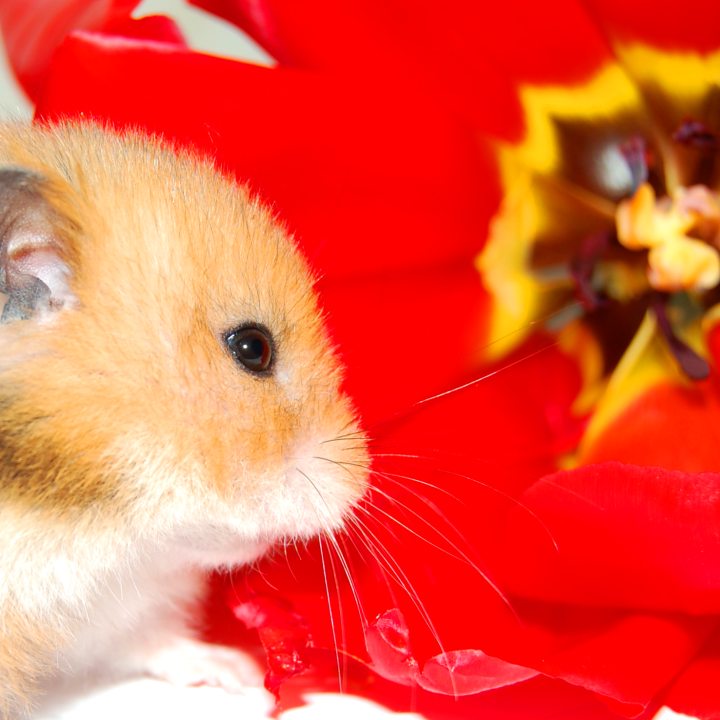 This funny hamster is a curious little animal which examines a red flower. This image showcases fun of this creature, highlighting a curiosity and the fact how big this beautifulFlower for this cutie. You can get this funny hamster image in high-resolution formats to have a joy and to share it with others.