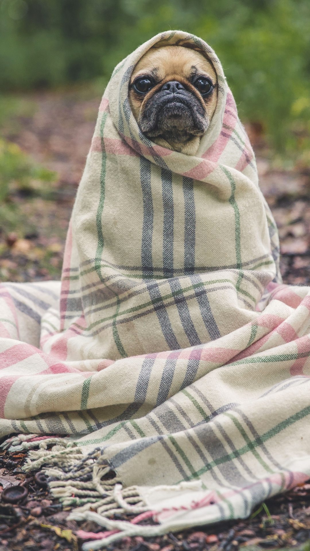A funny image highlights a cute dog wrapped in cozy blanket outdoors. Many animals want to feel a comfort too, not only people. This funny image brings humor, truly capturing a cozy moment. You can download this picture in various high-definition formats and share it to bring joy for other people.