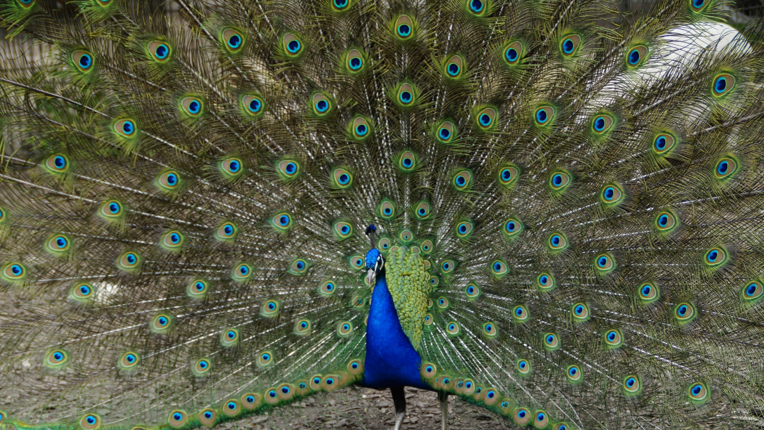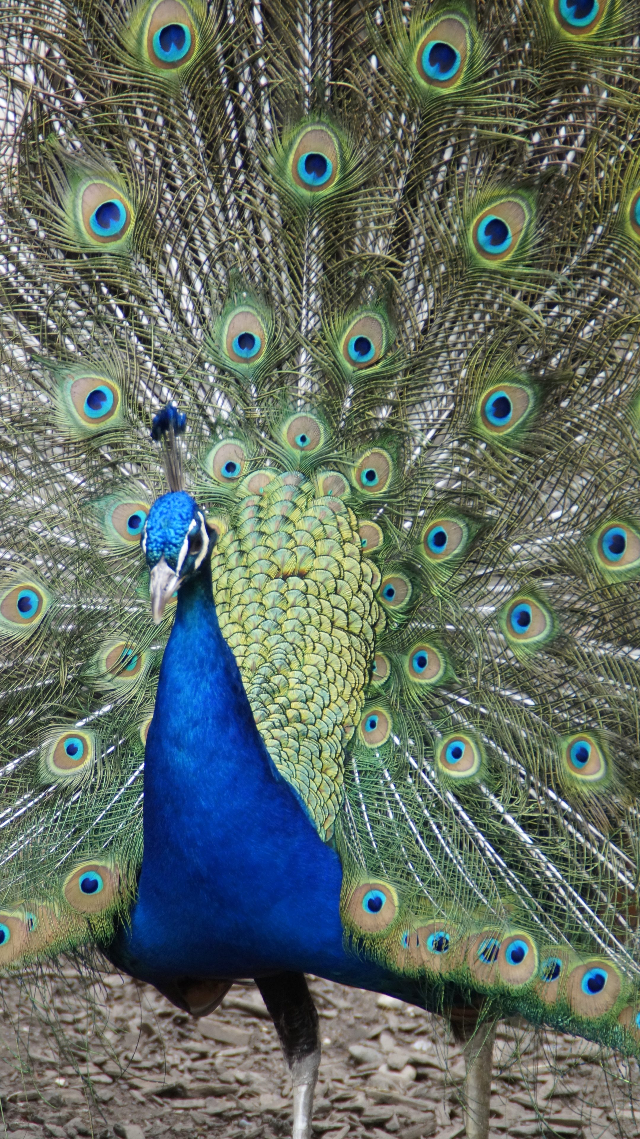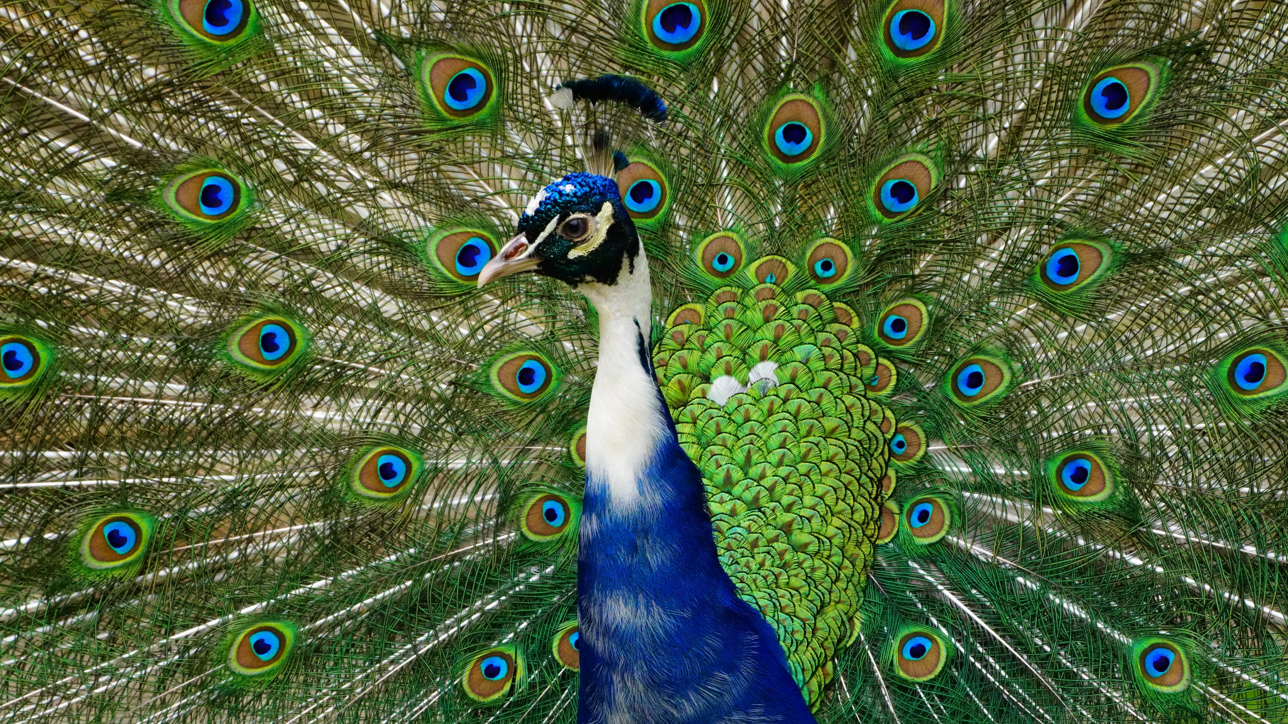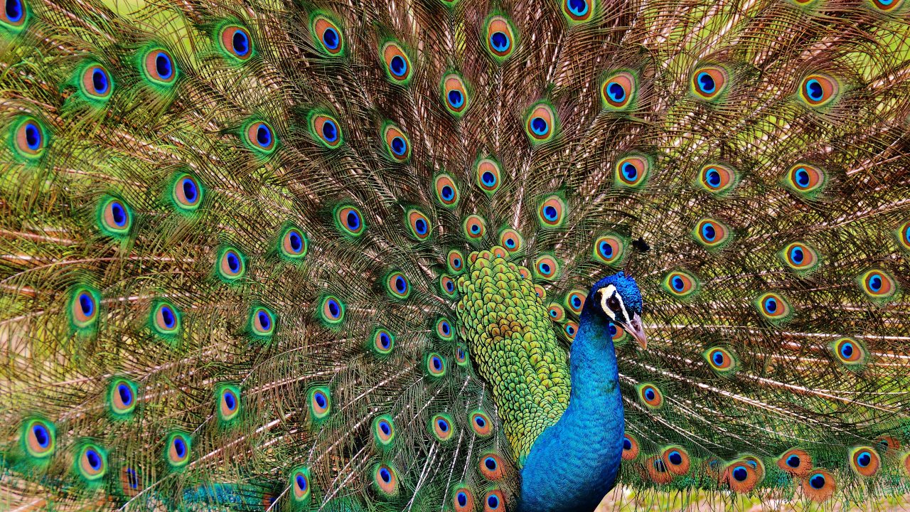 Exceptional peacock plumage featuring a stunning wide tail with beautiful patterns of eye spots.