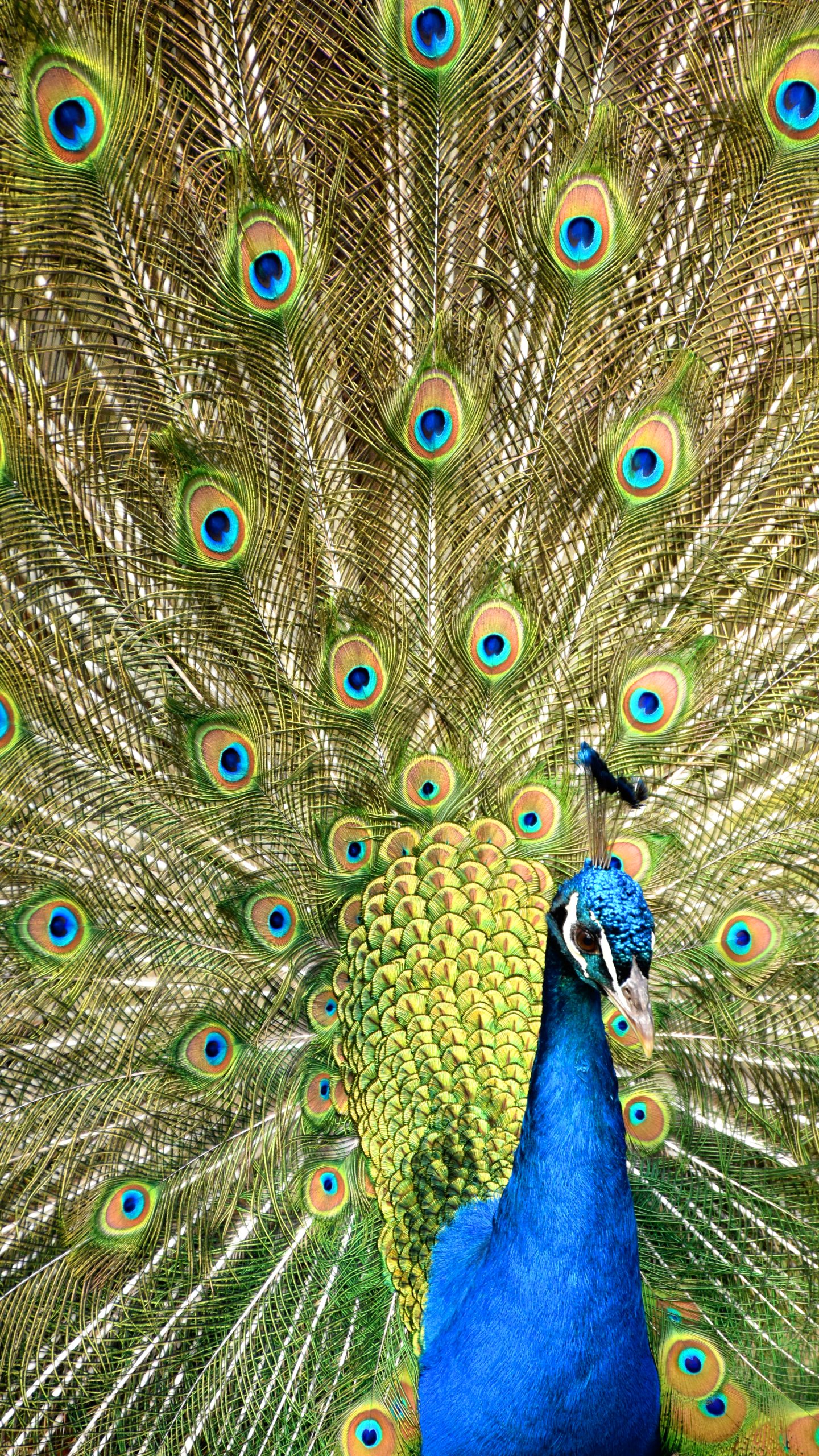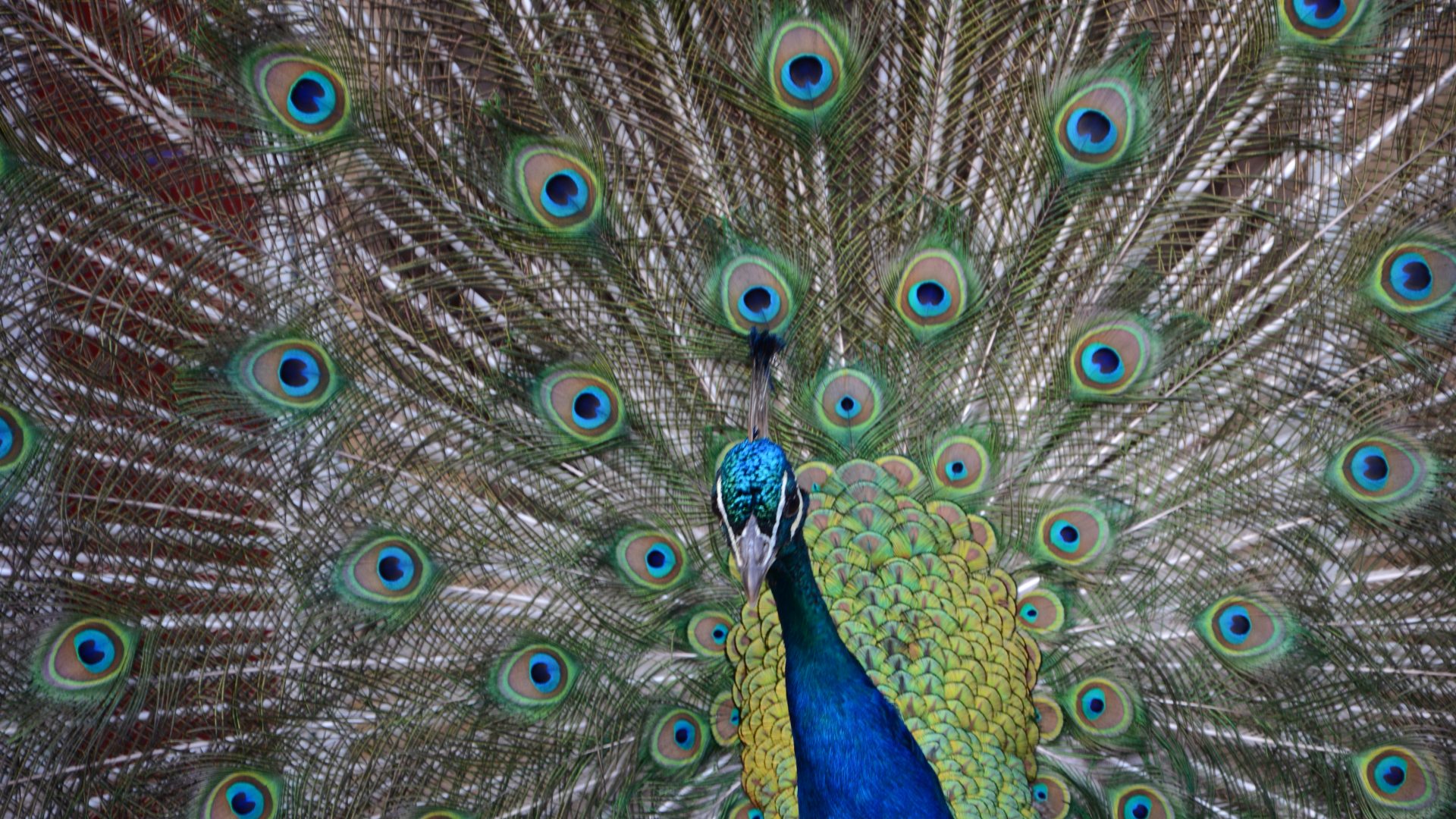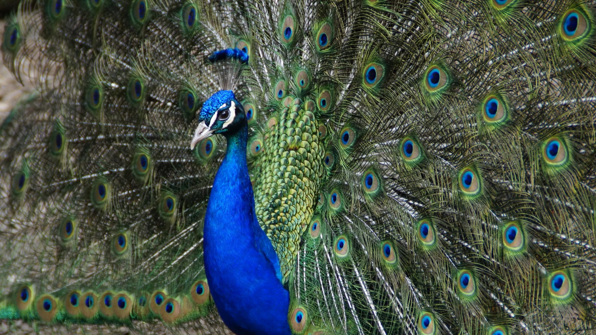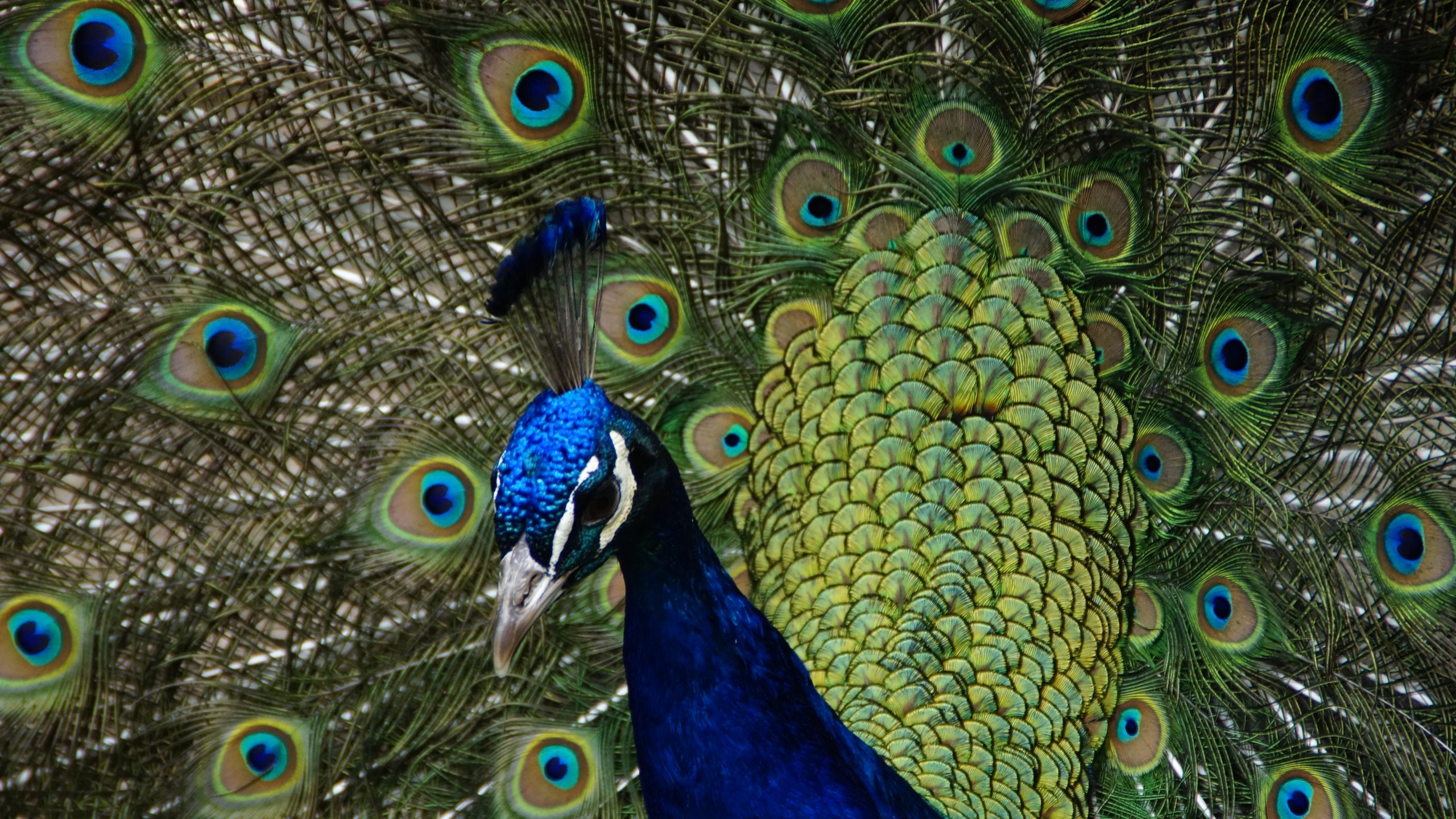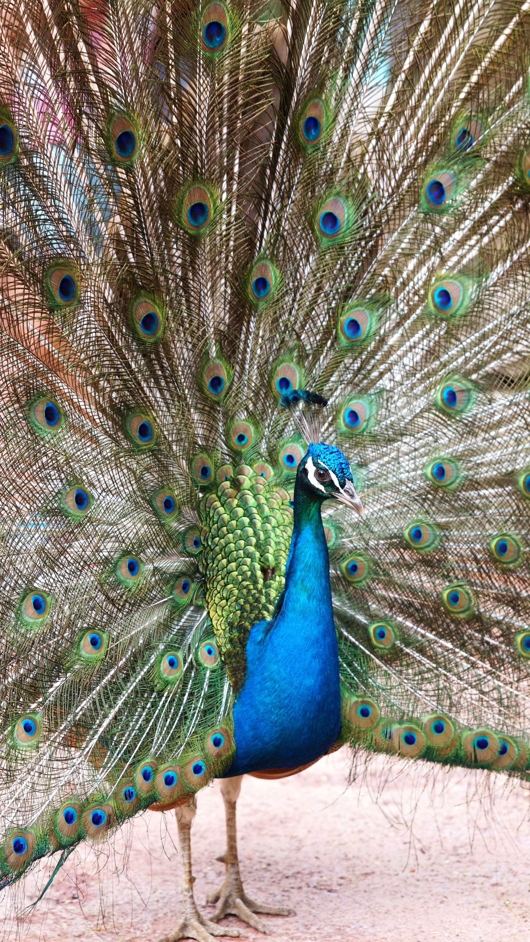 Exceptional peacock plumage featuring a stunning wide tail with beautiful patterns of eye spots.
