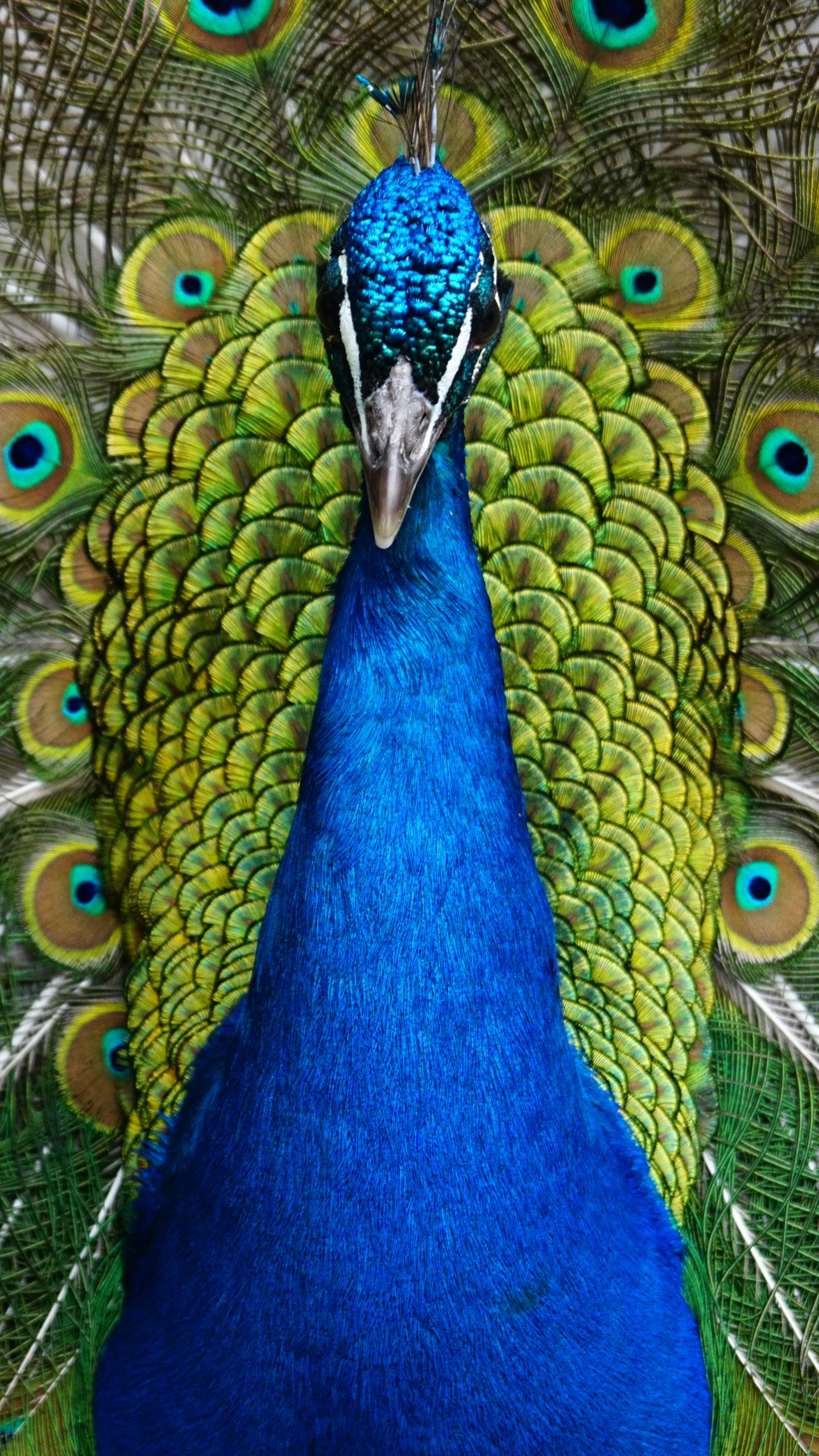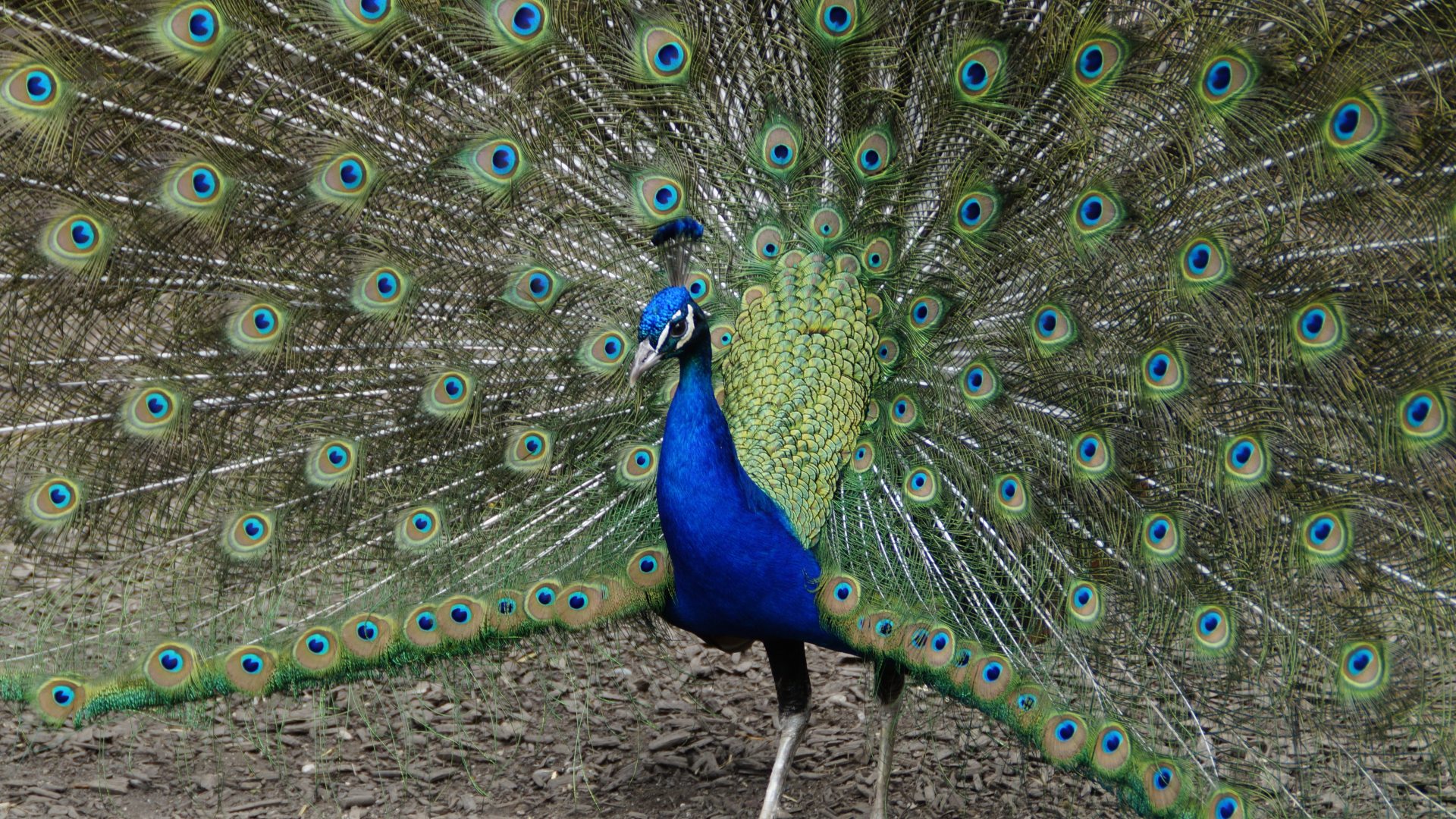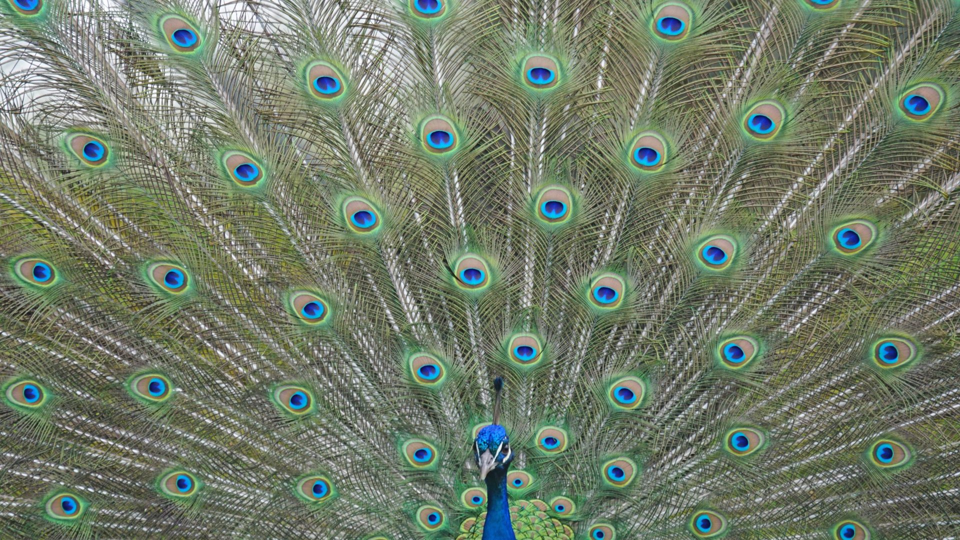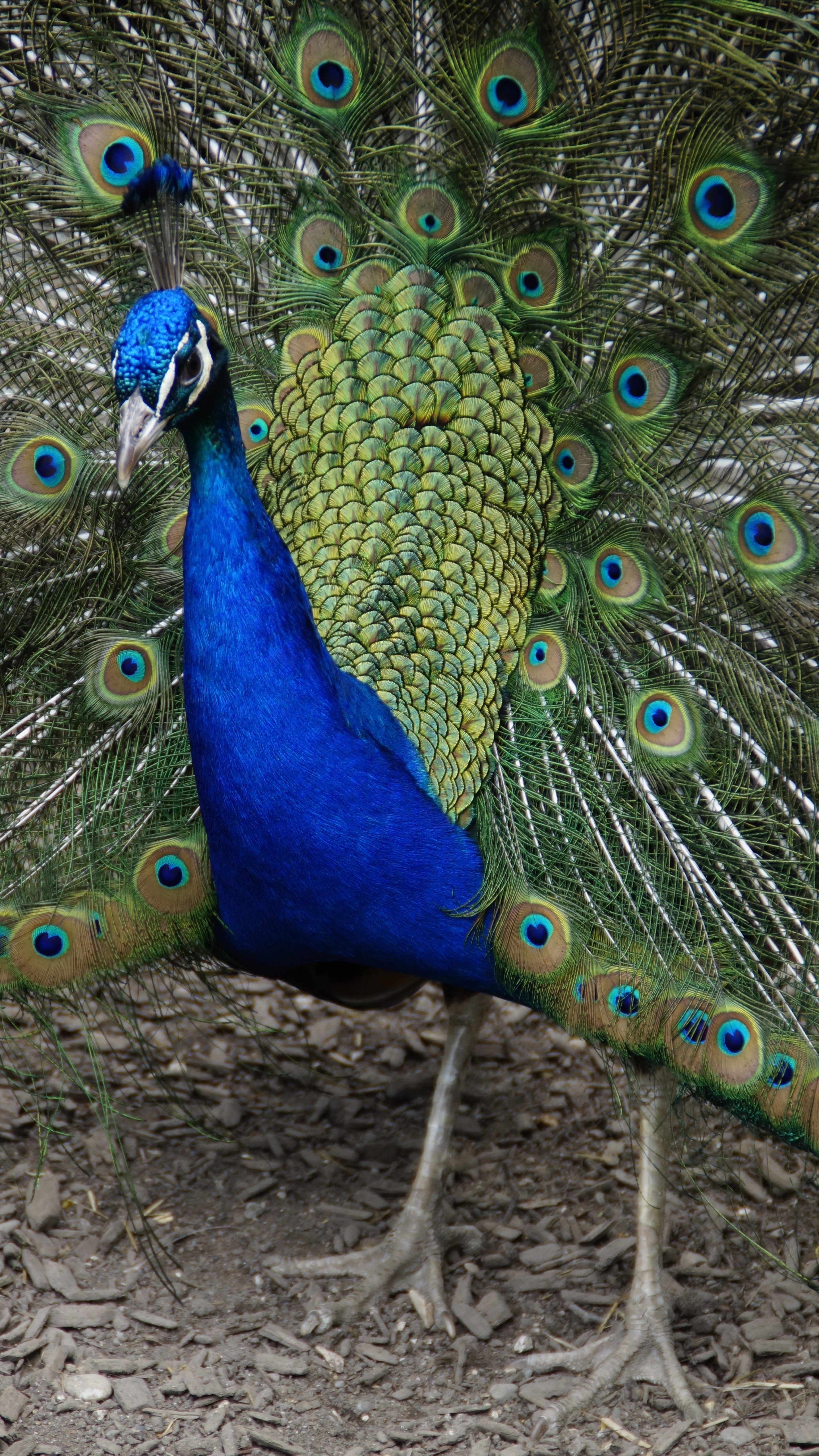 Exceptional peacock plumage featuring a stunning wide tail with beautiful patterns of eye spots.