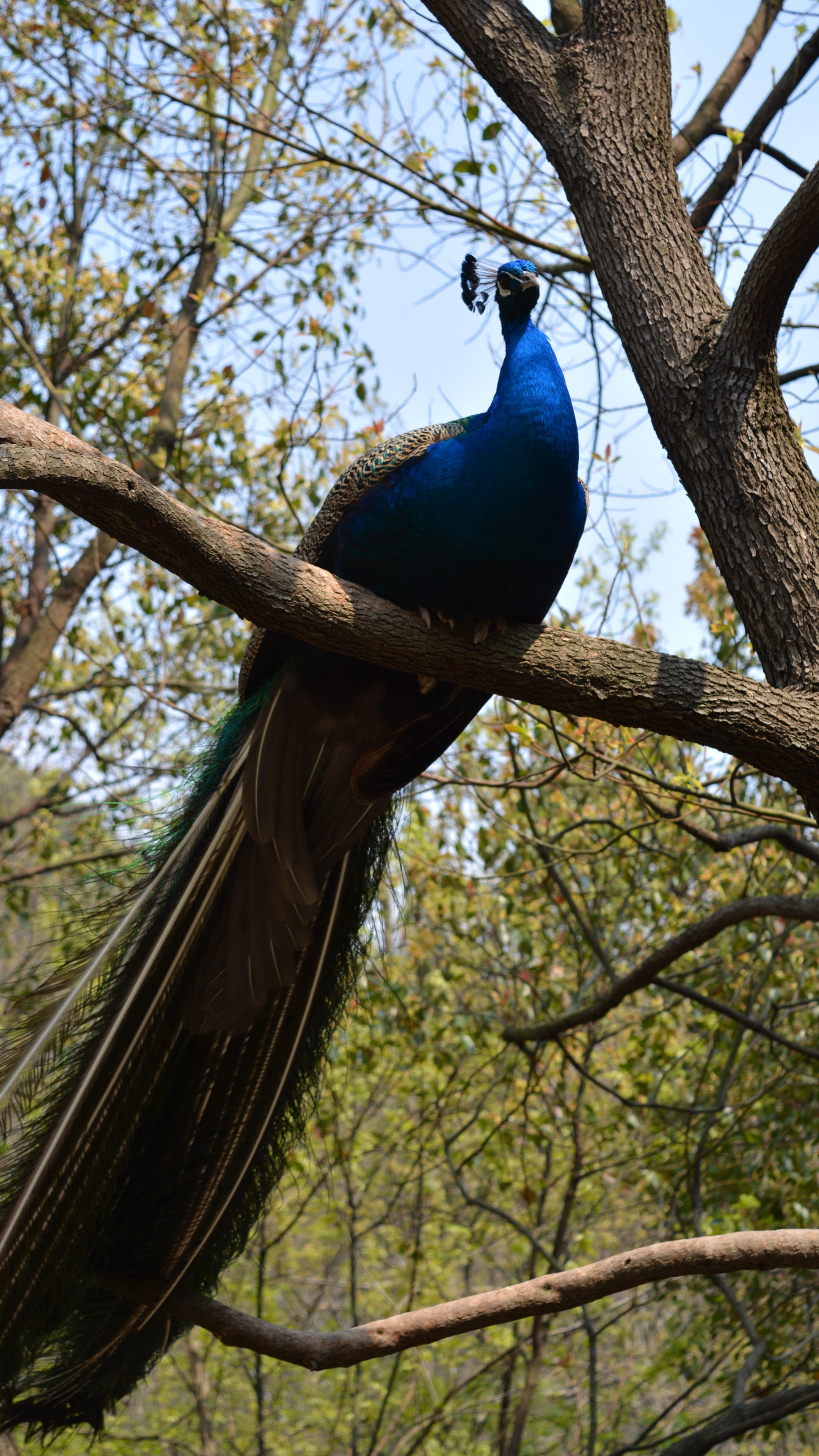 Exceptional graceful peacock with a long tail is sitting on a branch of a tree.