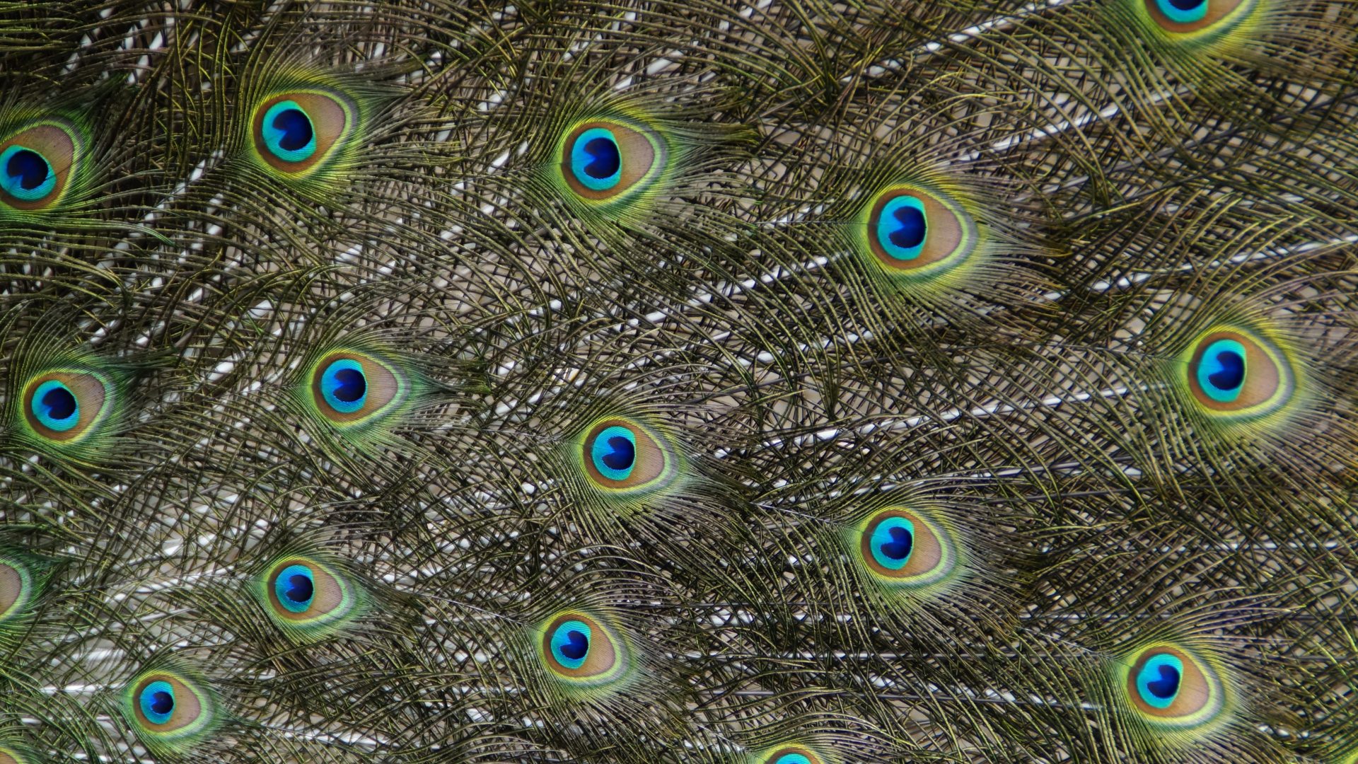 Magnificent peacock tail feathers with colorful eye patterns.