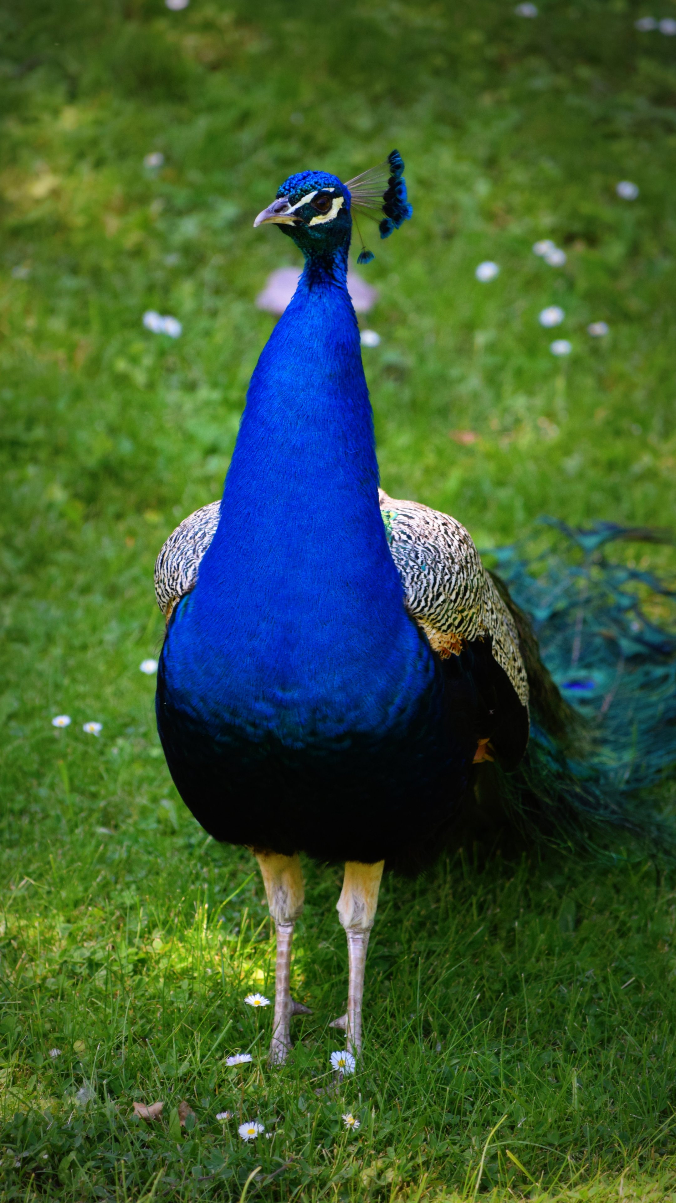 This bright peacock has tail feathers with multicolored eye patterns and looks amazing.
