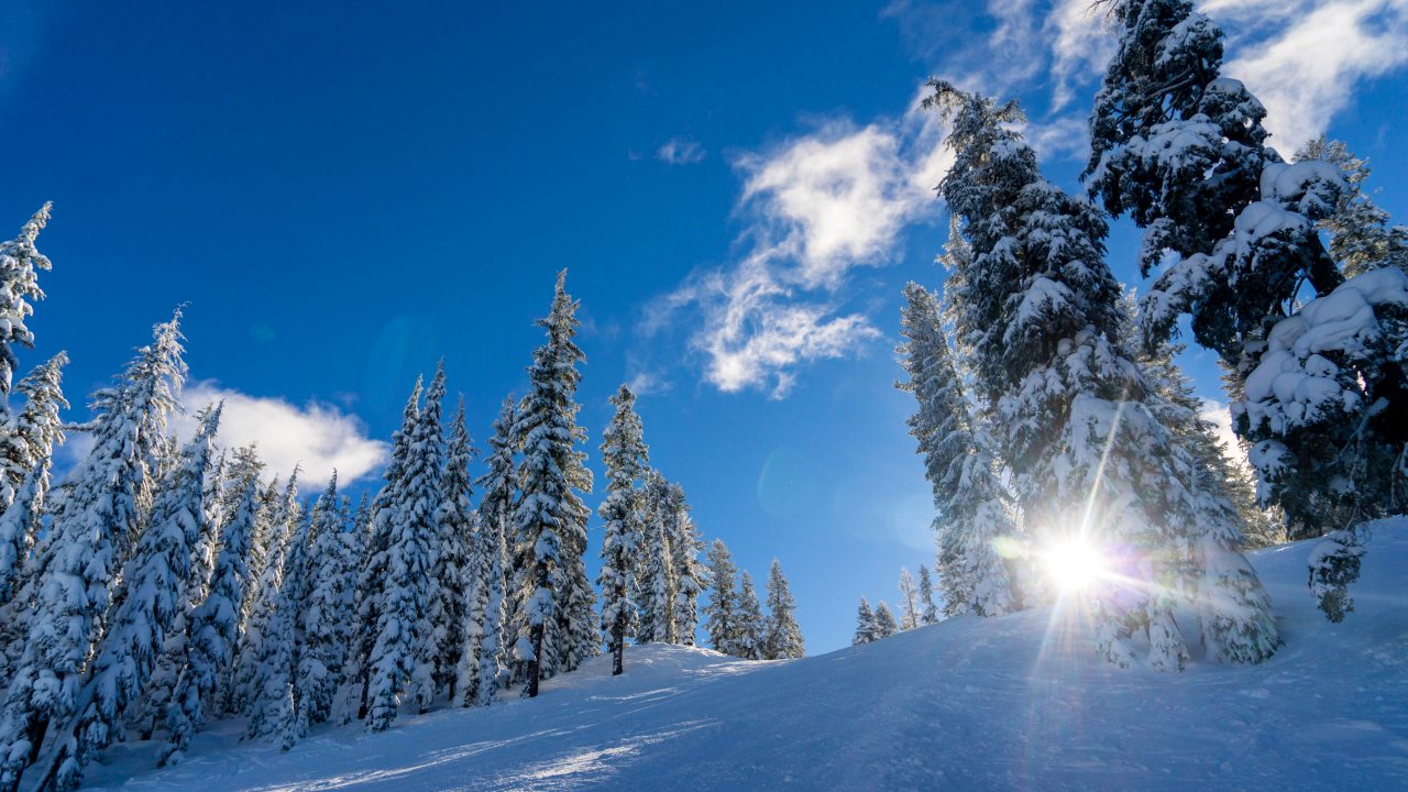 Spectacular cold wallpaper showing a snowy mountain with the bright sun shining through the tall trees.