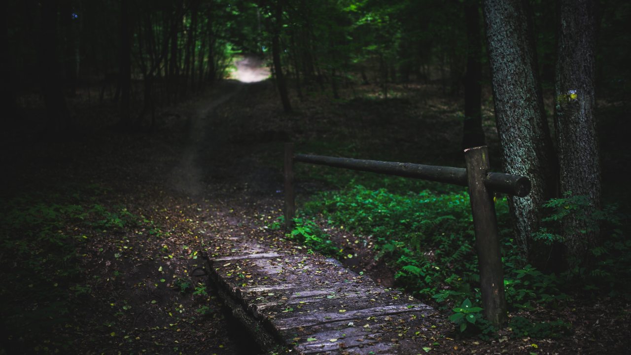 Captivating dark forest wallpaper with a little bridge among green trees.