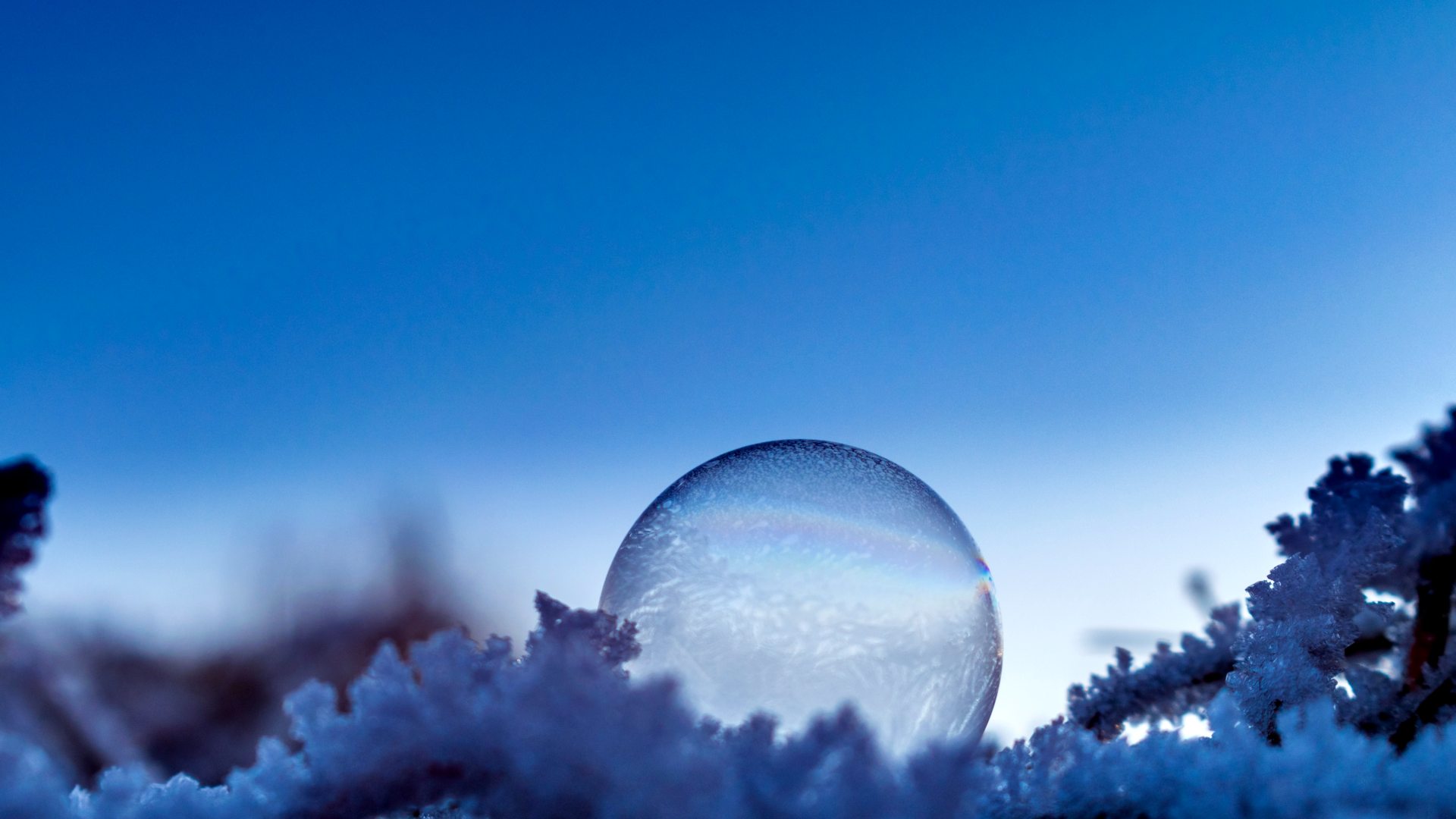 Graceful ice wallpaper featuring a vibrant sphere among snowy plants.
