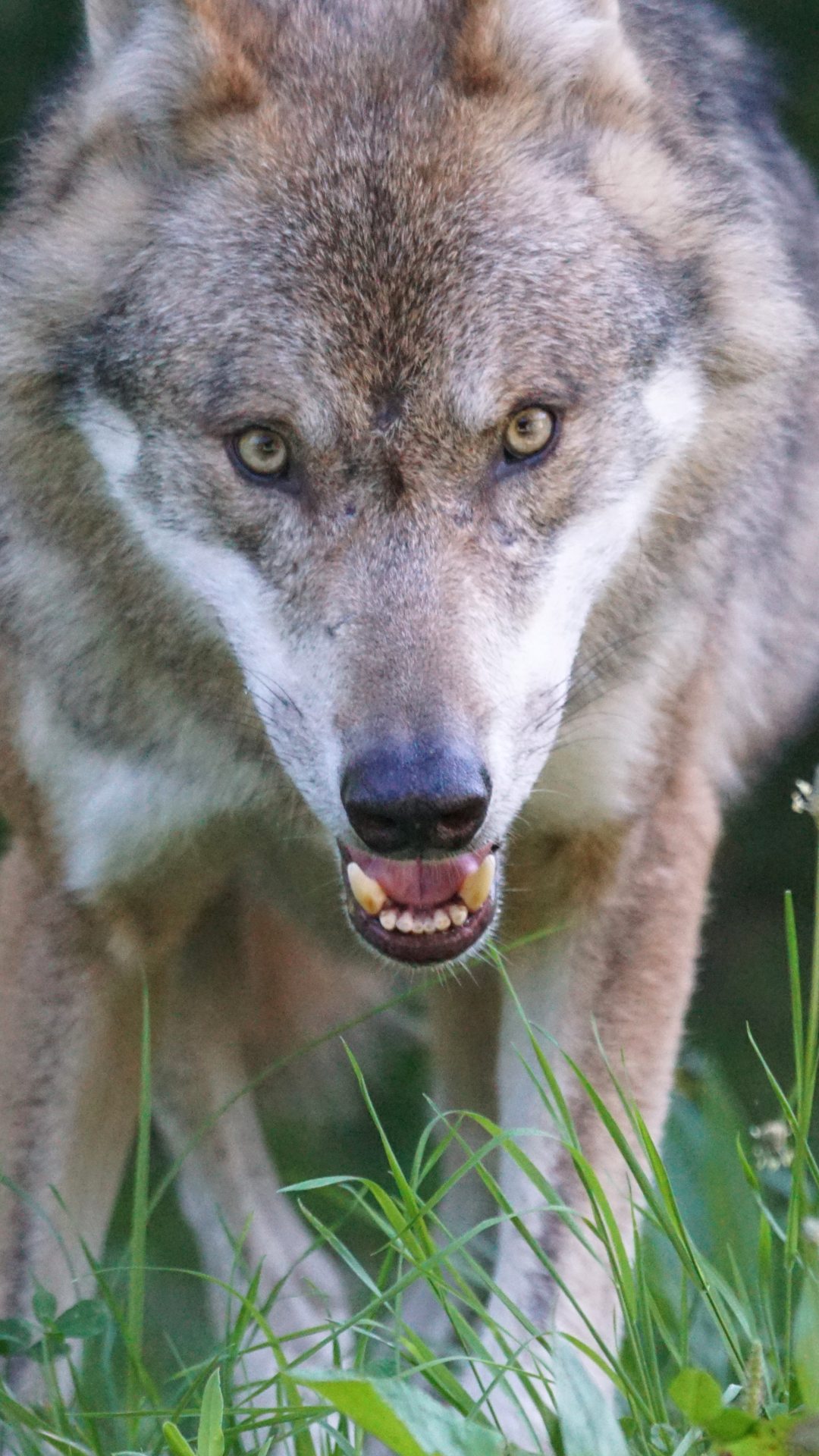 Stunning powerful wallpaper showing a charismatic wolf looking directly at the camera.