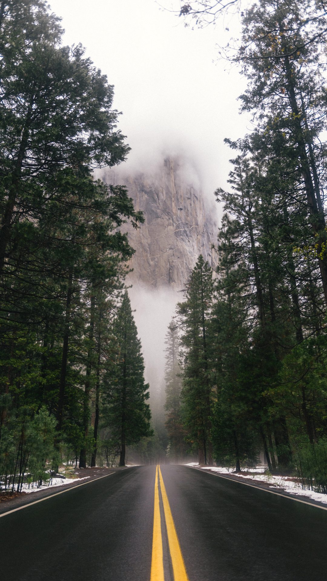 Breathtaking road wallpaper featuring majestic mountains and dark-green trees in the background.