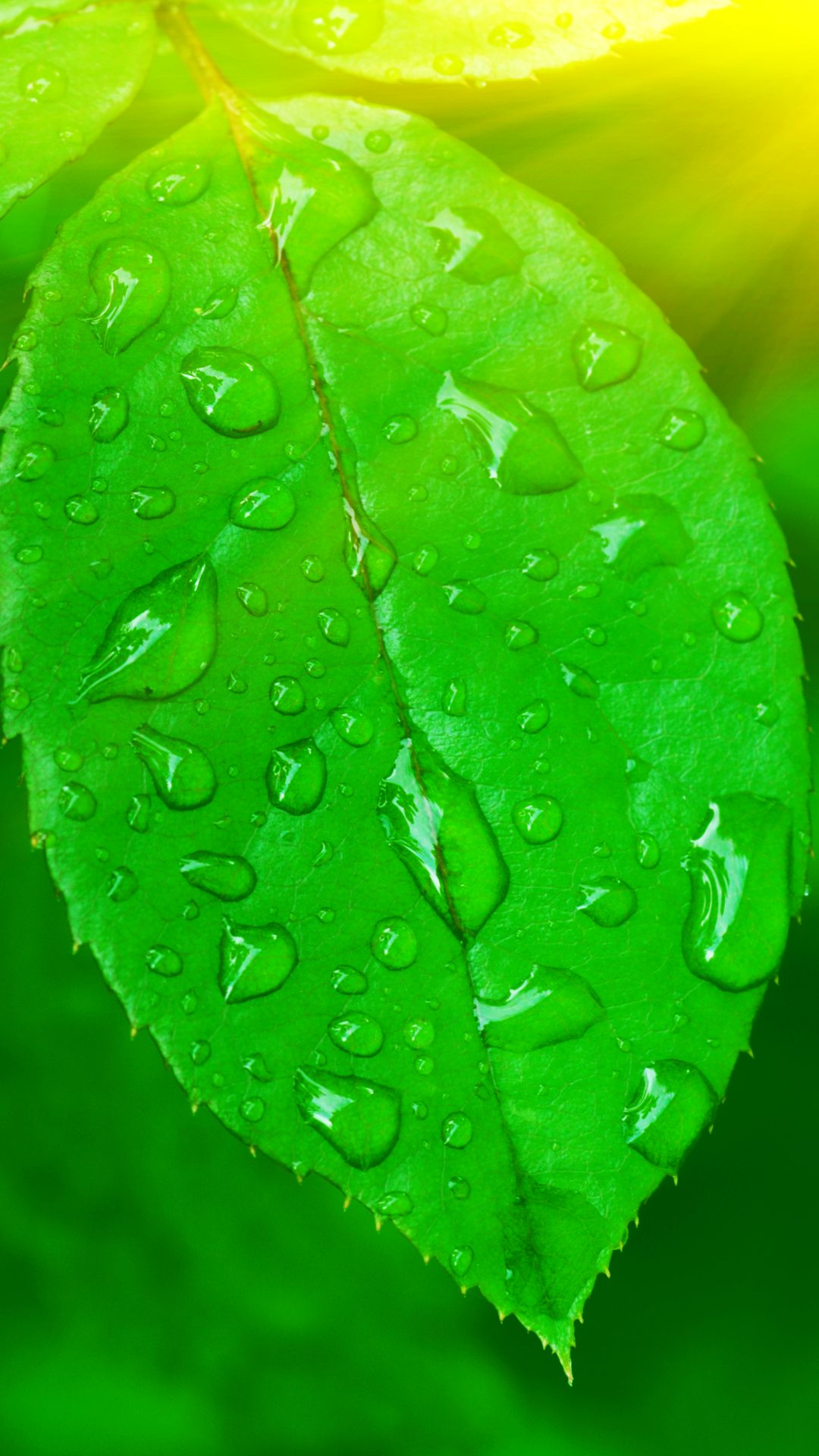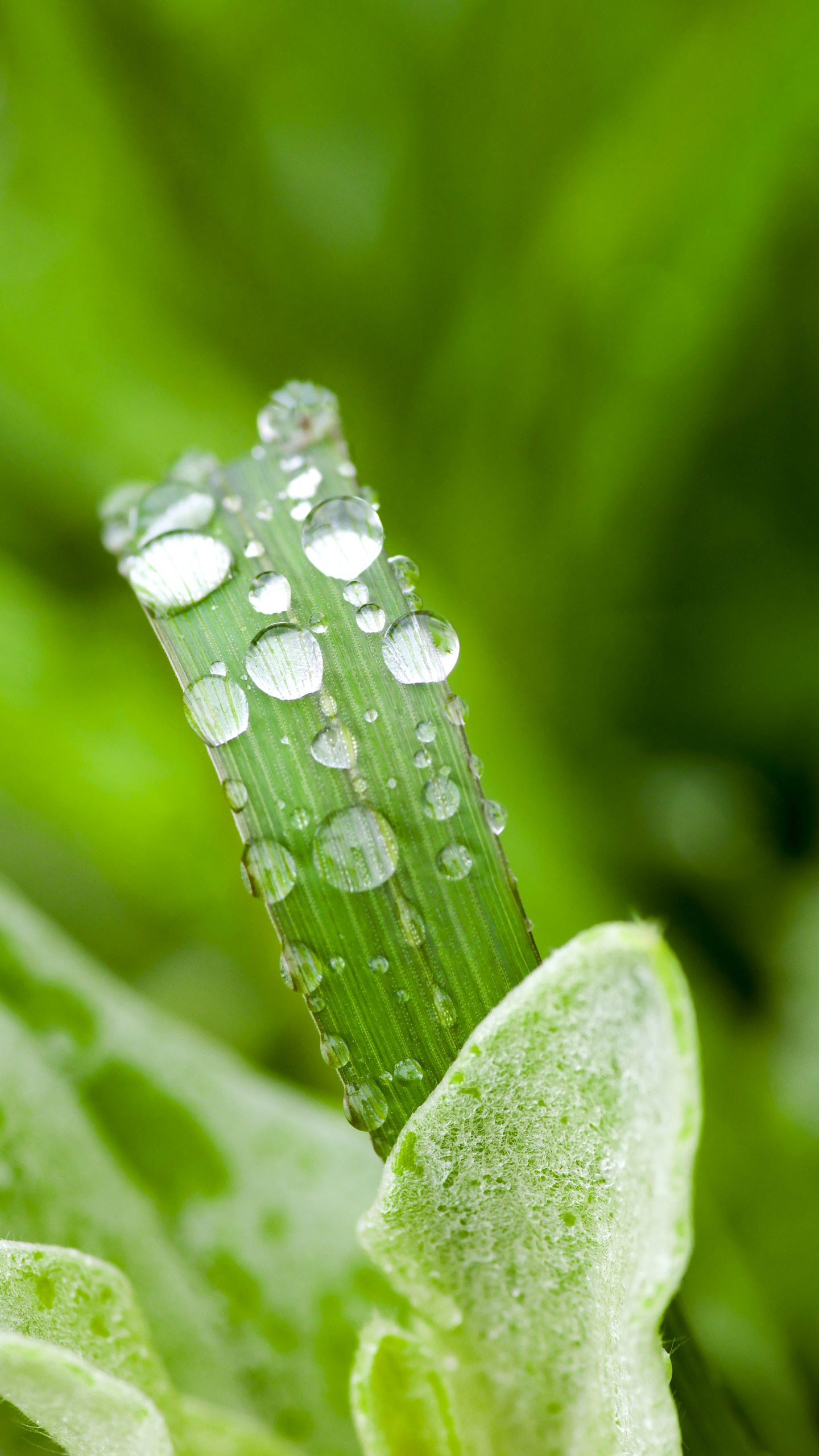 Mesmerizing serene wallpaper with vibrant water drops on green plants.