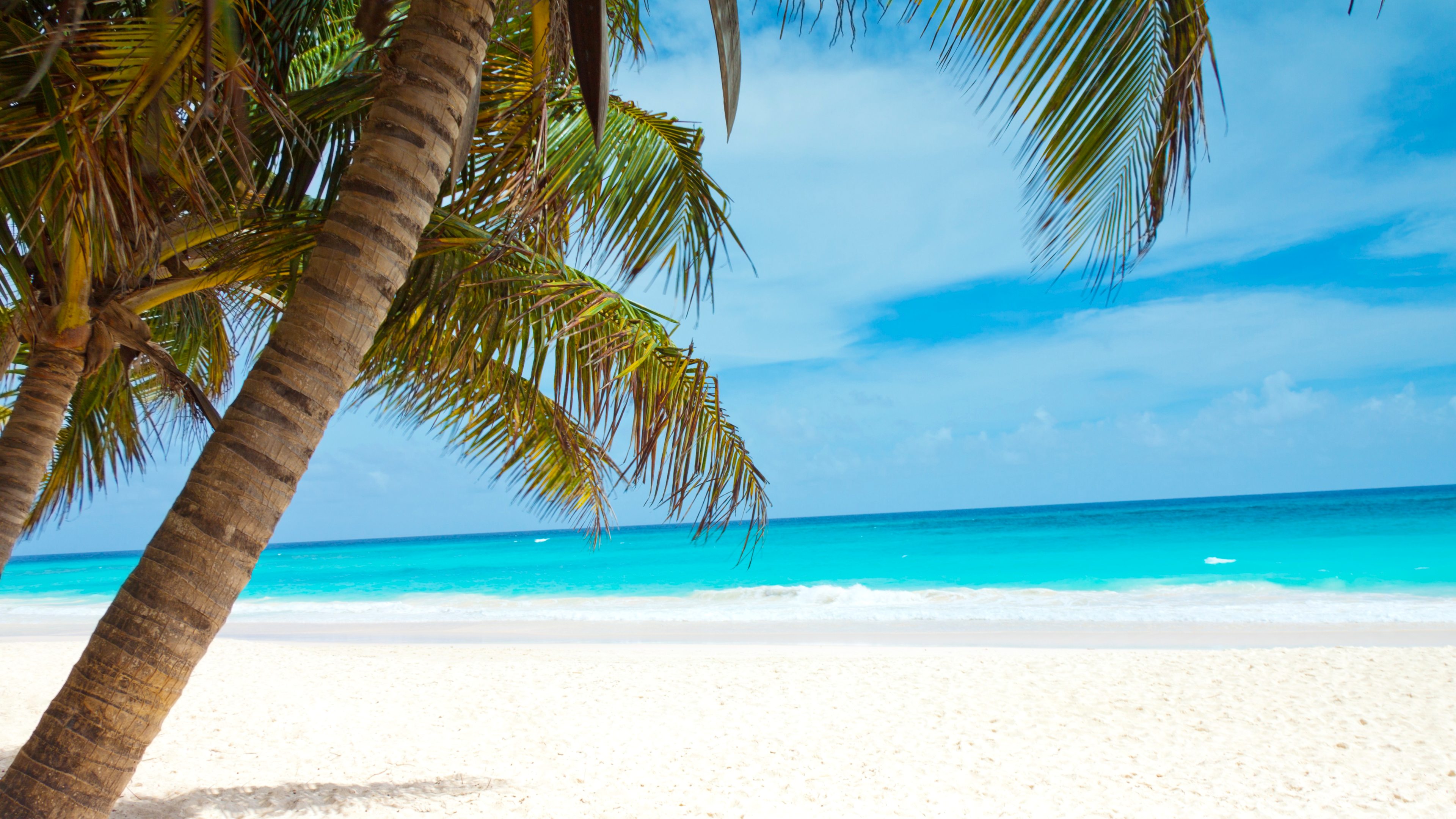 Majestic tropical beach wallpaper featuring colorful water with light sand and green palms.